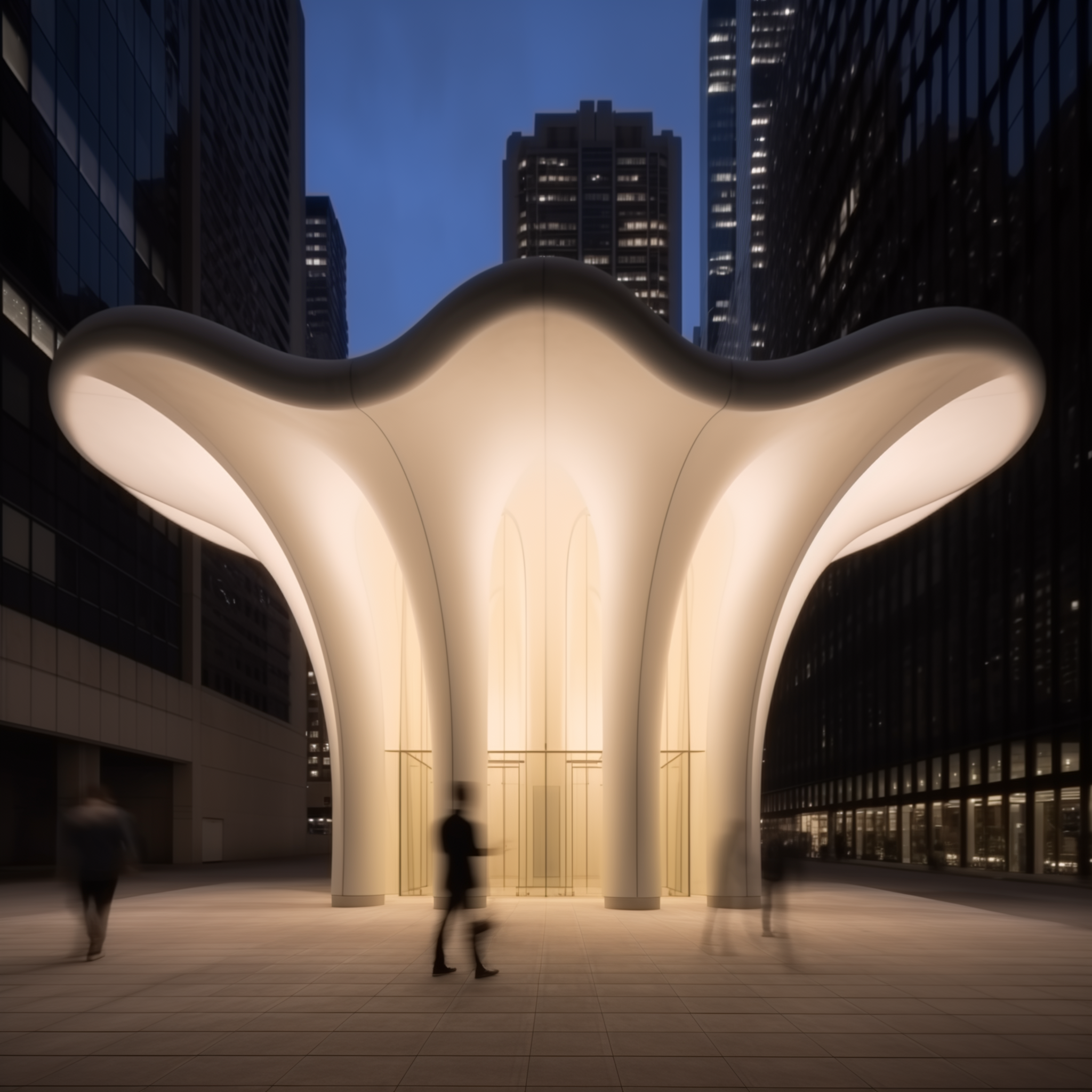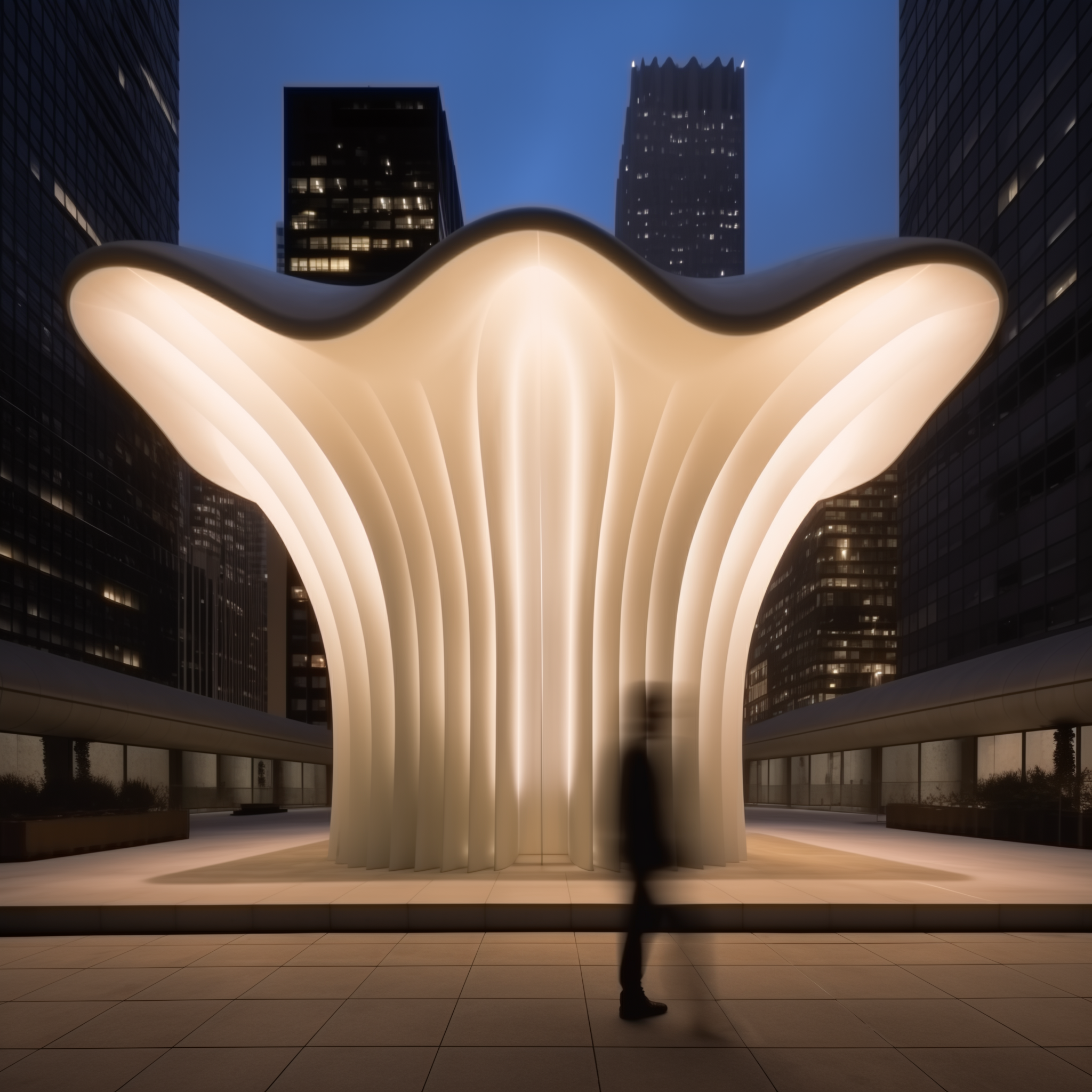 It reimagines the landscape of New York City with a series of organic-shaped pavilions. These structures, inspired by natural forms, are strategically placed throughout the city to create harmonious spaces where light and architecture meet. This personal venture was a canvas for unconstrained creativity, allowing a free-flowing exploration of form and function. Each pavilion was meticulously design using advanced AI software, showcasing a symbiosis of technology and design. This experimental project not only pushes the boundaries of traditional architectural practices but also demonstrates the innovative potential of 3D printing in urban spaces.