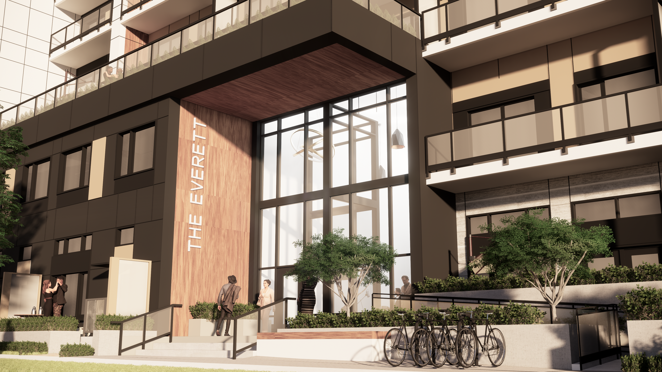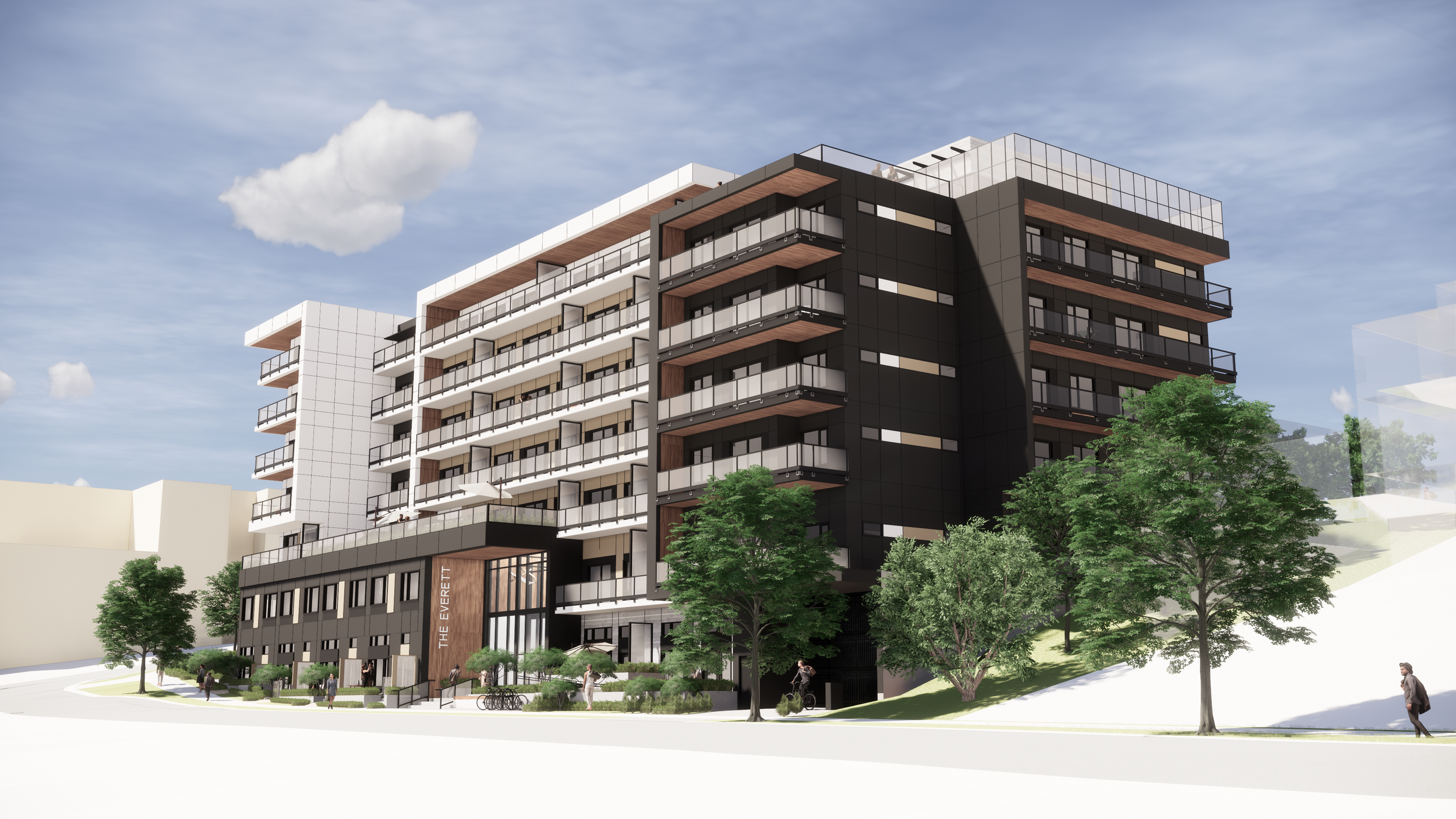 Architectural design of residential building with 182 market units in Vancouver, situated on a complex sloped terrain. The use of black and white volumes helps break the mass of the building, while the touches of wood makes it feel more warm and elegant.