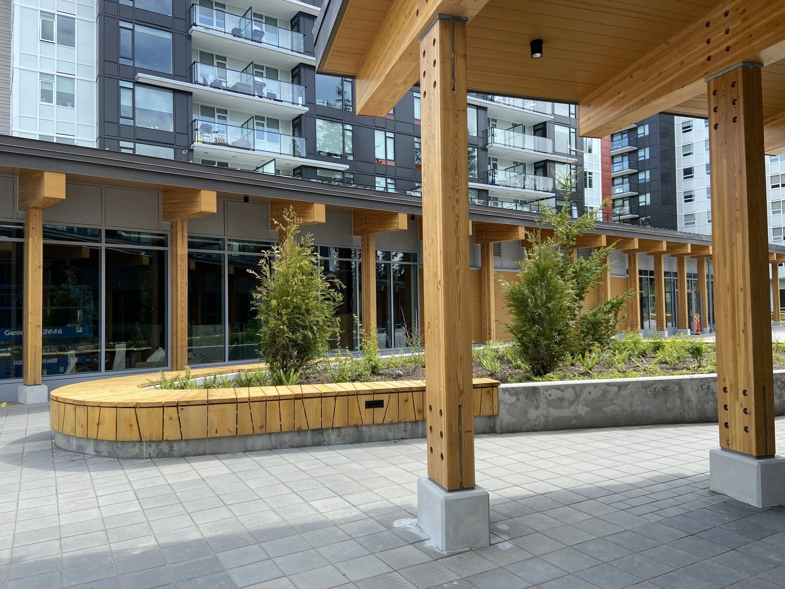 The development consists of three mixed-use buildings (173 rental units) with commercial space on the ground level and an outdoor public plaza. The project is intended to be the Village Center for the local First-Nation community at the University Endowment Lands in BC. All three buildings meet the highest sustainability standards in the region.